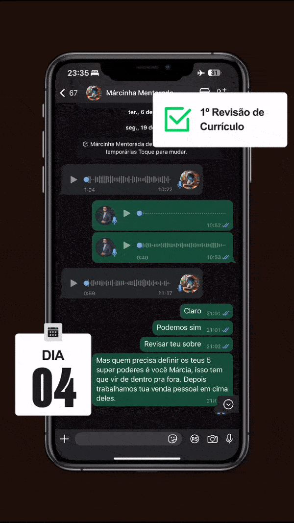 Imagine que você tem a entrevista mais importante da sua vida amanhã e vai poder tirar todas suas dúvidas com um recrutador, receber ajuda para treinar suas respostas, pedir conselhos sobre a vaga, ajuda para controlar o nervosismo e se tornar o candidato escolhido do processo seletivo! Eu me comprometo com você tanto que reafirmo: